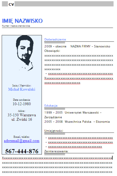 Uwypuklający zdjęcie oraz dane kontaktowe szablon CV. Dla osób z małym doświadczeniem/studentów. Modyfikacja kolorystyki GRATIS.